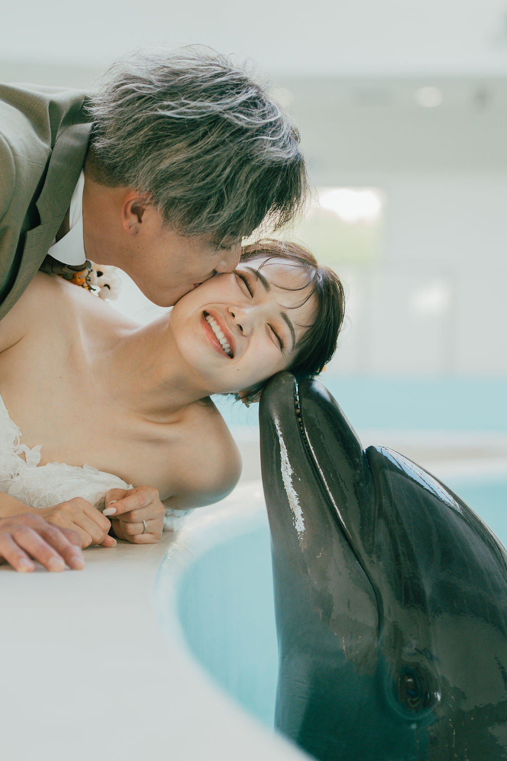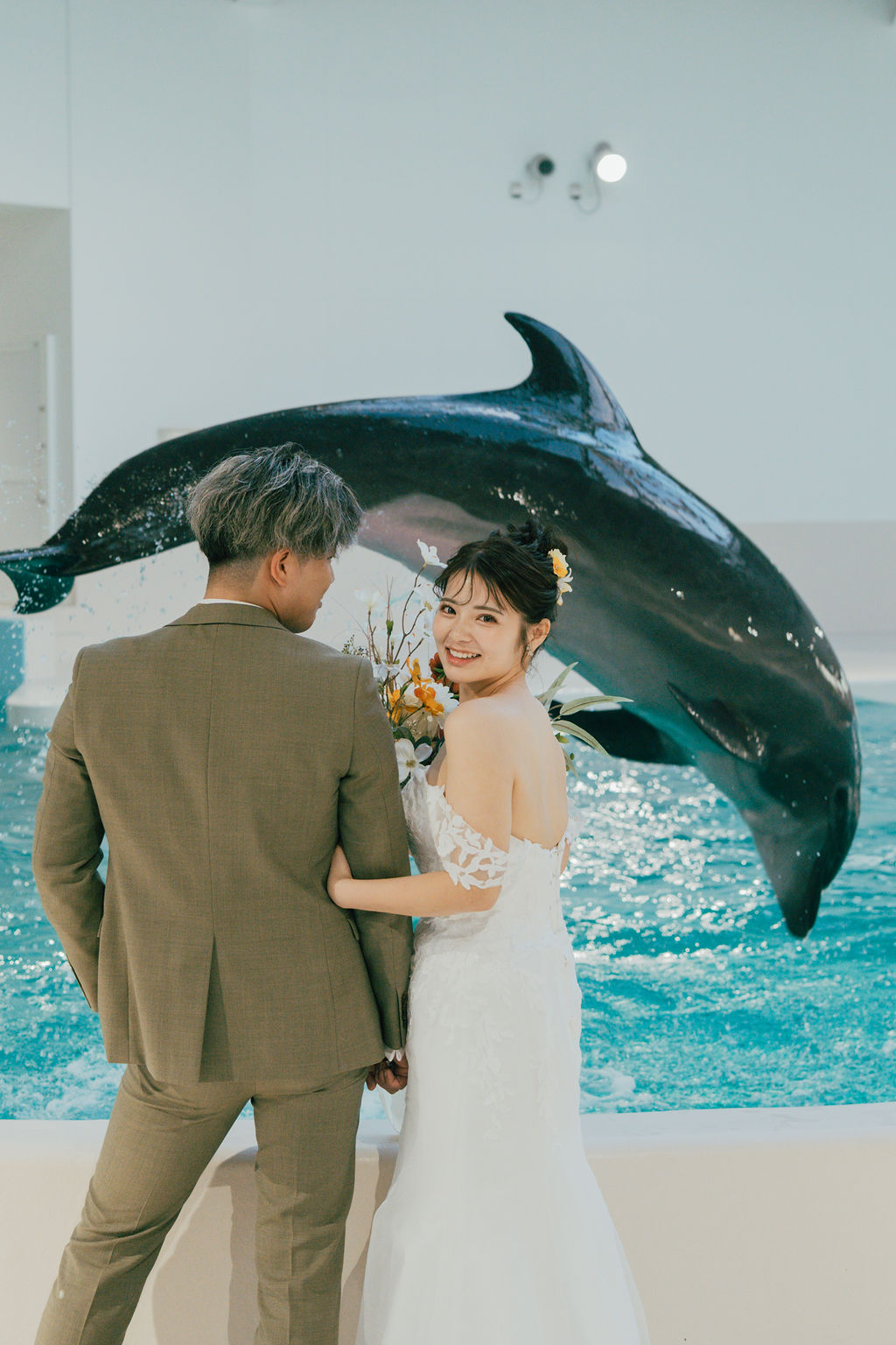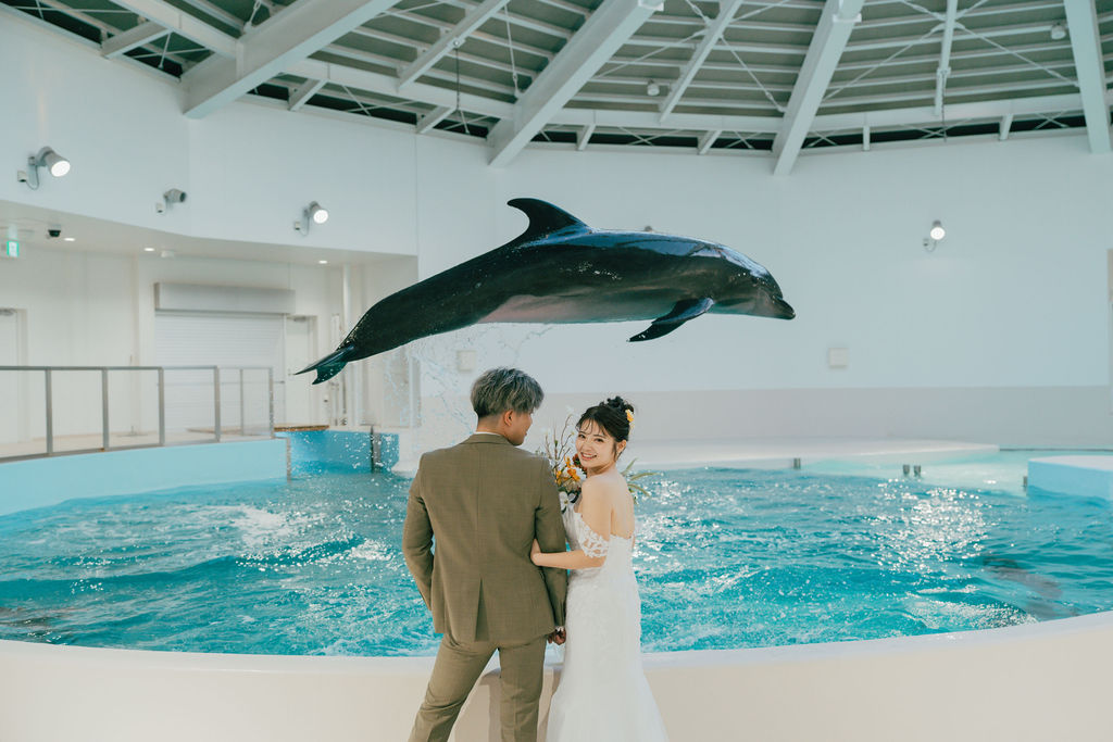 可愛いイルカと一緒に撮れるウェディングフォト